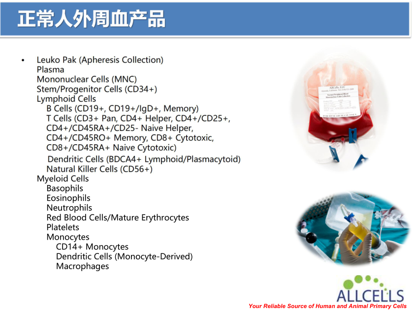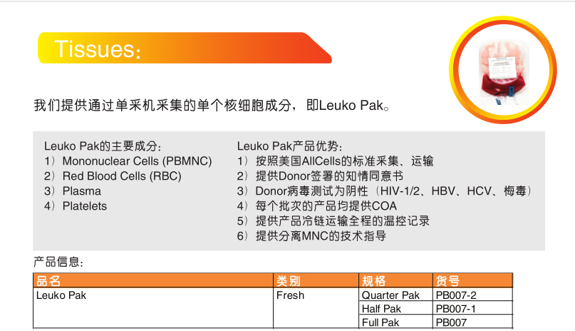 如上圖所示,健康人外周血、骨髓、臍血、動員外周血分離出的單個(gè)核細(xì)胞、CD3+ T cells、CD34+ Cells、MSC等可用于細(xì)胞治療研發(fā)的產(chǎn)品均在我司代理銷售范圍內(nèi),歡迎感興趣的客戶垂詢!