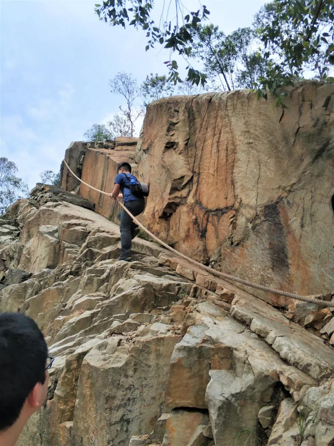 或許對于登山愛好者來說,這條繩索和這種斜度的小道根本不足掛齒。但是咱們市場部絕大多數(shù)同事都是登山小白,所以當(dāng)我們看到這條索道的時(shí)候,都不由得發(fā)出陣陣驚嘆,同時(shí)心里又忍不住小小的興奮了一把——每天在朋友圈看登山愛好者曬圖,這下我們也有牛x轟轟的圖可以曬了!立刻自拍!