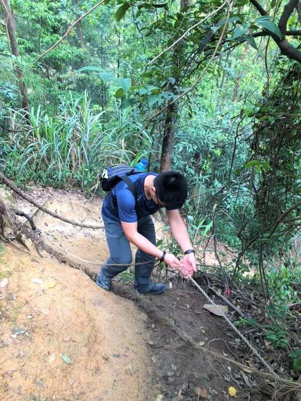 登山過程中,我們必須找到合適的角度和落腳點(diǎn),并且借助樹的力量才能一步一步的往上爬而不至于往下滑,所以大家都用著堪比蝸牛的速度緩緩向山上挪動(dòng)。這期間我們也偶遇了不少登山愛好者,他們或身輕如燕或身手敏捷,憑借過硬的登山裝備和過人的走位技術(shù),風(fēng)一般從我們身邊掠過,與緩慢向上攀登的我們完全是兩個(gè)畫風(fēng)......