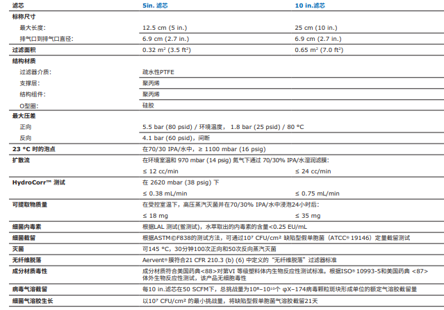 | 23°C時的擴(kuò)散 | 通過一個在965mbar(14psi)氮氣下的70/30IPA/水濕膜,每10英寸濾芯<24毫升/分鐘 | |