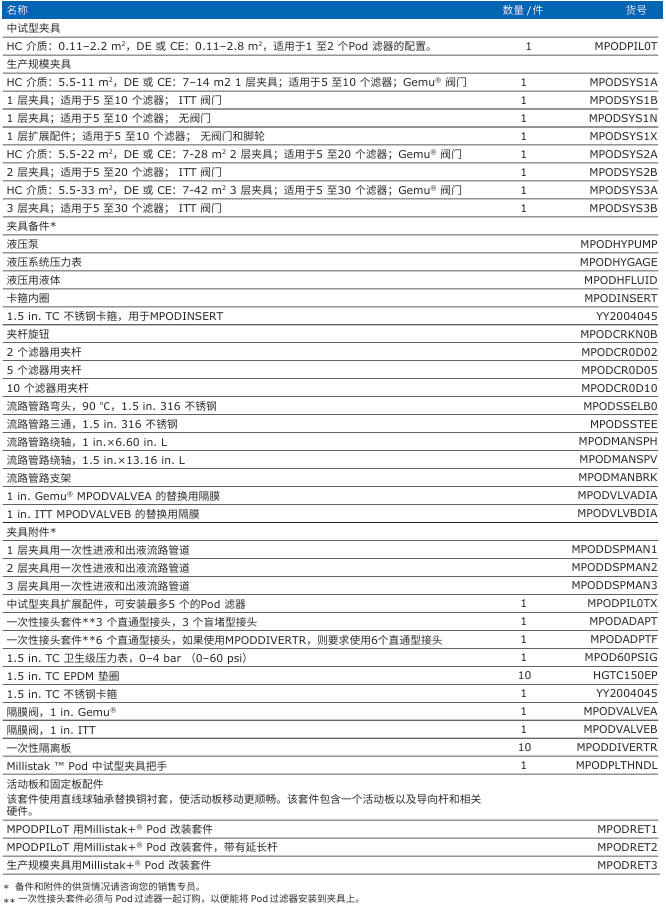 Millistak+® Pod 系統(tǒng)包含:中試型夾具/生產規(guī)模夾具、一次性接頭、一次性隔離板、一次性進液和出液管路。