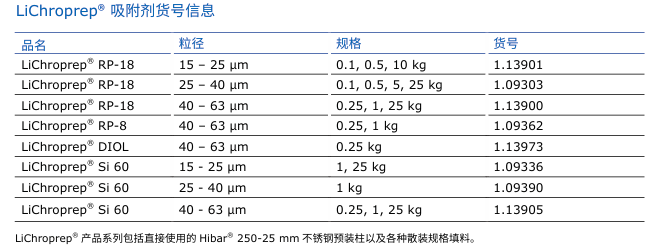 LiChroprep® 硅膠吸附劑,具有多孔性和不規(guī)則的特點,嚴格分為 15-25 μ m、 25-40 μm 和 40-63 μm 粒徑范圍,表現(xiàn)了良好的分離性能和足夠的穩(wěn) 定性,且擁有非常高的性價比。