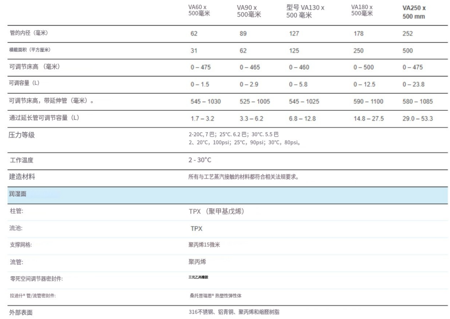 Vantage® A2 工業(yè)色譜柱技術參數(shù):