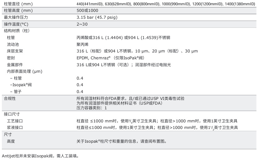 IsoPak® 工業(yè)規(guī)模生物層析柱技術參數(shù):