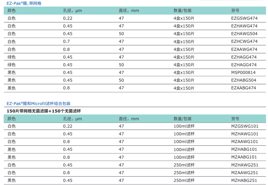 每張膜片外包裝上都印有貨號、批次號、孔徑和序列號(從150到1)