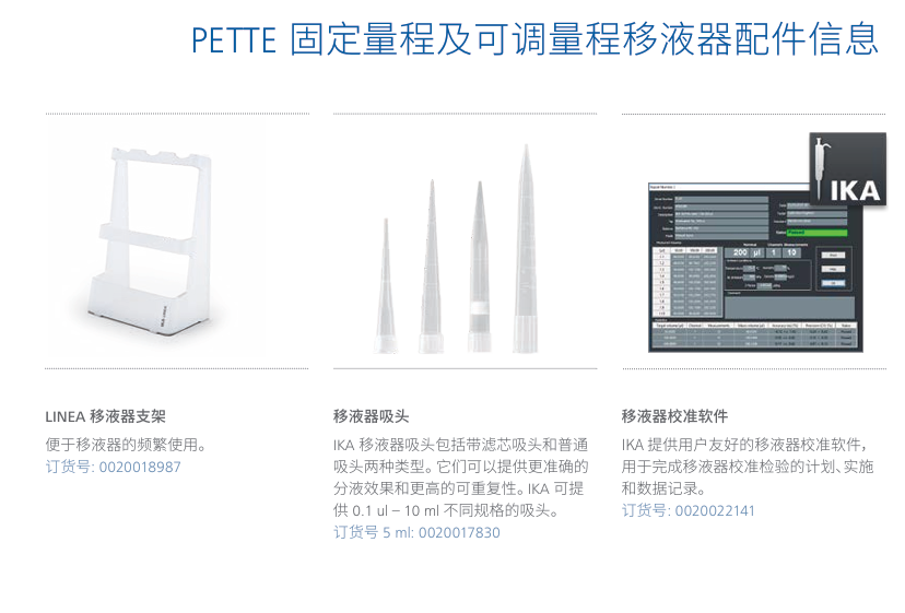 IKA 單通道固定量程和可調(diào)量程移液器具備人體工程學(xué)設(shè)計及精準(zhǔn)可靠的特性,使 得其可以滿足現(xiàn)代實驗室多樣化的應(yīng)用需求。 顏色標(biāo)識量程范圍,易于快速選擇合 適的移液器。 抗沖擊、耐 UV 及化學(xué)腐蝕性、圓錐吸嘴,使得其可以長期穩(wěn)定的完成 移液工作。 IKA PETTE 固定量程及可調(diào)量程移液器可以整支高壓滅菌,使其消毒更 容易。 這些性能確保無故障、精準(zhǔn)、安全的操作。