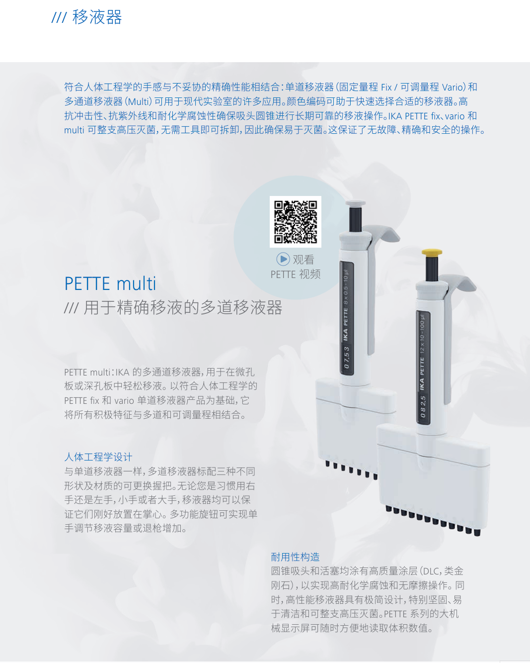 PETTE fix, vario and multi /// 簡單易用的移液體驗,固定和可調(diào)量程 IKA 單通道和多通道移液器具備人體工程學(xué)設(shè)計及精準(zhǔn)可靠 的 特性,使得其可以滿足現(xiàn)代實驗室多樣化的應(yīng)用需求。 顏色 標(biāo)識量程范圍,易于快速選擇合適的移液器。 抗沖擊、耐 UV 及 化學(xué)腐蝕性,使 得其可以長期穩(wěn)定的完成移液工作。 PETTE fix, vario 和 multi 支持 整支滅菌,使其消毒更容易。 這些性能確保 無故障、精準(zhǔn)、安全的操作。
