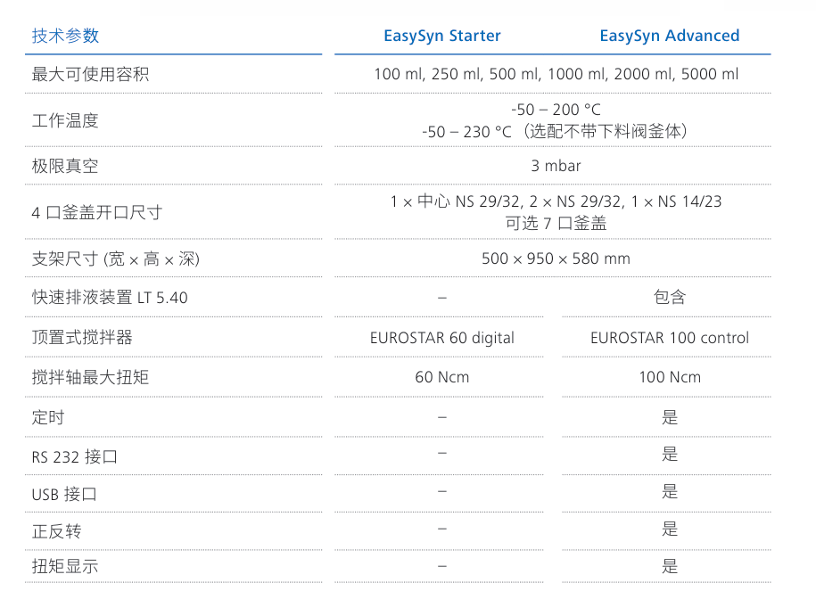 - EasySyn 的雙壁反應(yīng)容器容量從 100 ml 到 5000 ml 不等,屬中等規(guī)模,可靈活升級(jí)。進(jìn)行化學(xué)反應(yīng)安全、穩(wěn)定,可重復(fù)。