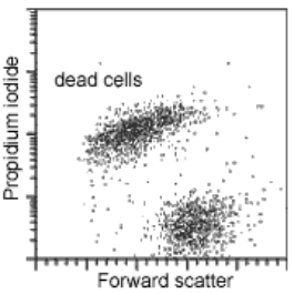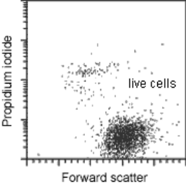通過使用死細(xì)胞去除微珠標(biāo)記細(xì)胞,并在MidiMACS™分離器的磁場中使用LS柱分離,從培養(yǎng)的細(xì)胞(Jurkat細(xì)胞)中清除死細(xì)胞。死亡細(xì)胞用碘化丙啶熒光染色。