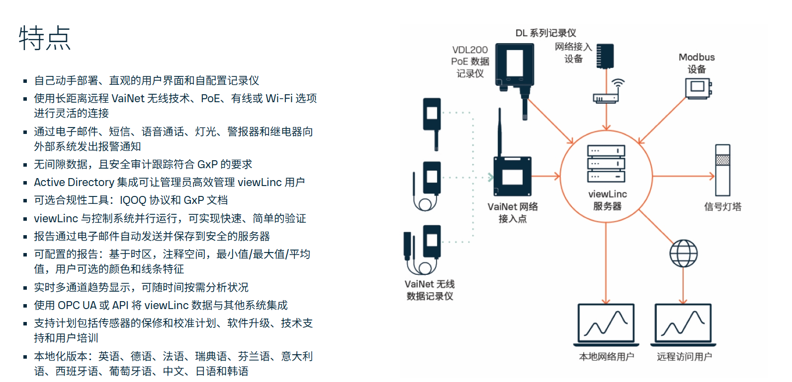 作為維薩拉環(huán)境監(jiān)測系統(tǒng)的軟件組件,viewLinc 提供報警、實時趨勢數(shù)據(jù),和遵守 GxP 法規(guī)的報告。采用維薩拉傳感器,viewLinc 可監(jiān)測溫度、相對濕度、CO2、壓差、門開關(guān)等。 viewLinc 還支持 Modbus 變送器,讓您可以將其他多種參數(shù)納入到 viewLinc 中:微粒計數(shù)器、流量和液體測量和其他傳感器。