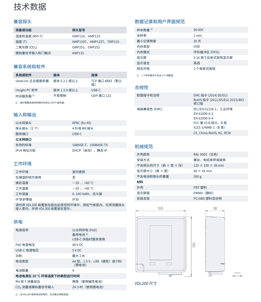 - VDL200 配備了用于監(jiān)測(cè)溫度、相對(duì)濕度和二氧化碳水平的探頭輸入,可跨多種應(yīng)用提供多用途、可擴(kuò)展的監(jiān)測(cè)。