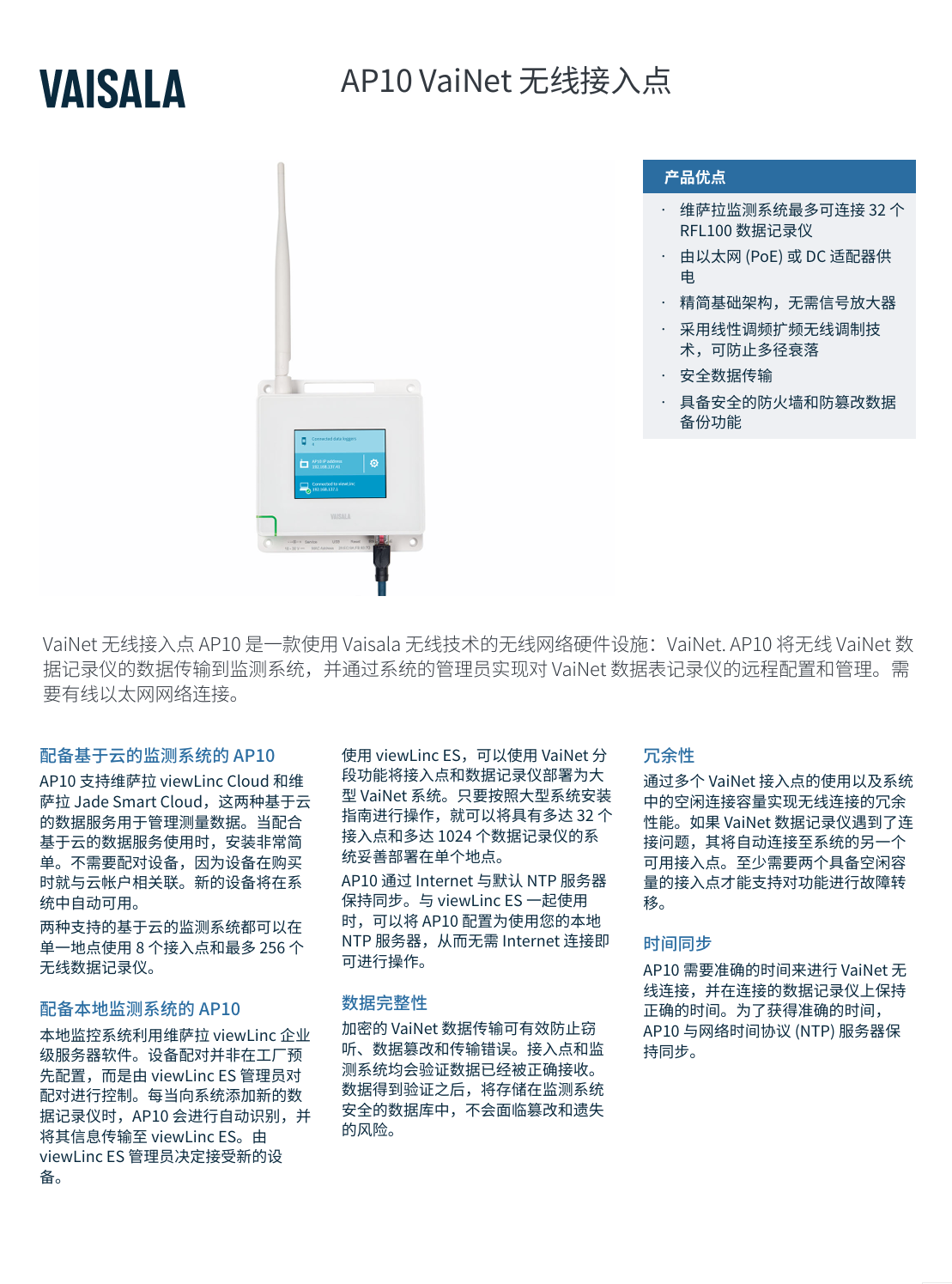 VaiNet 無線連接點 AP10 是一款無線網(wǎng)路硬件設(shè)備,針對維薩拉的無線技術(shù):VaiNet。AP10 最多可將 32 個 VaiNet 無線數(shù)據(jù)記錄器連接到維薩拉的監(jiān)測系統(tǒng)軟件:viewLinc 企業(yè)服務(wù)器。