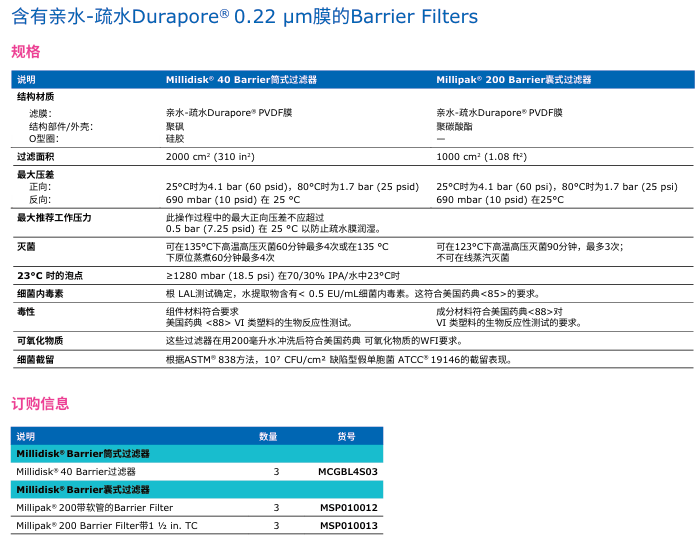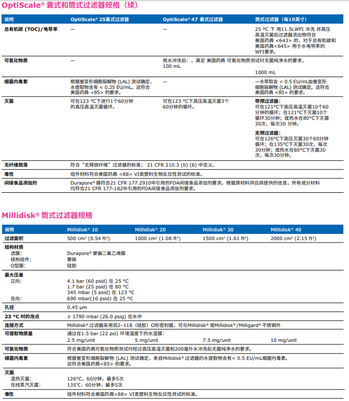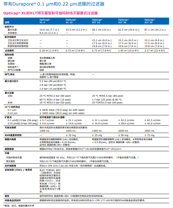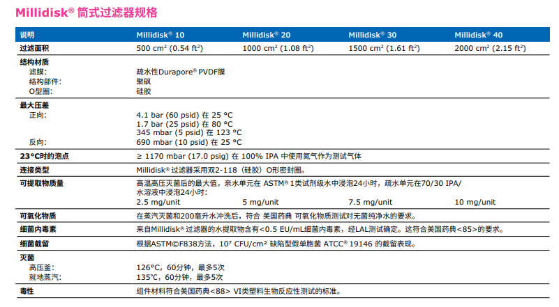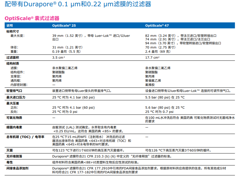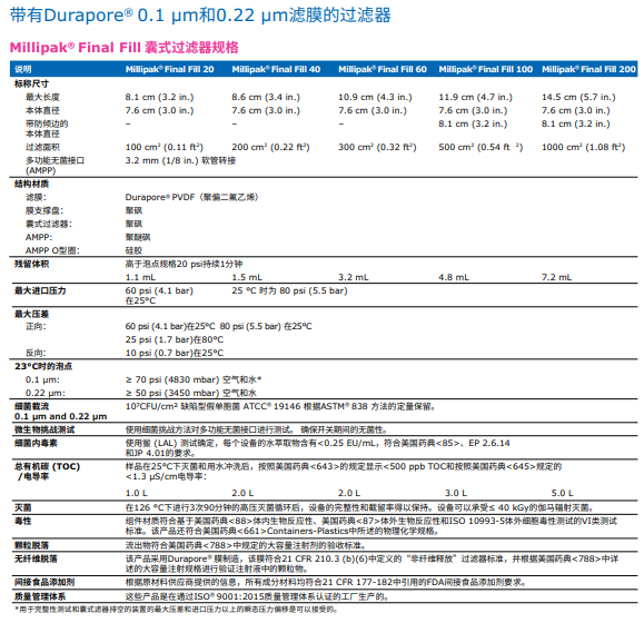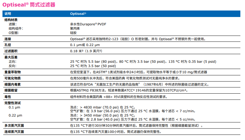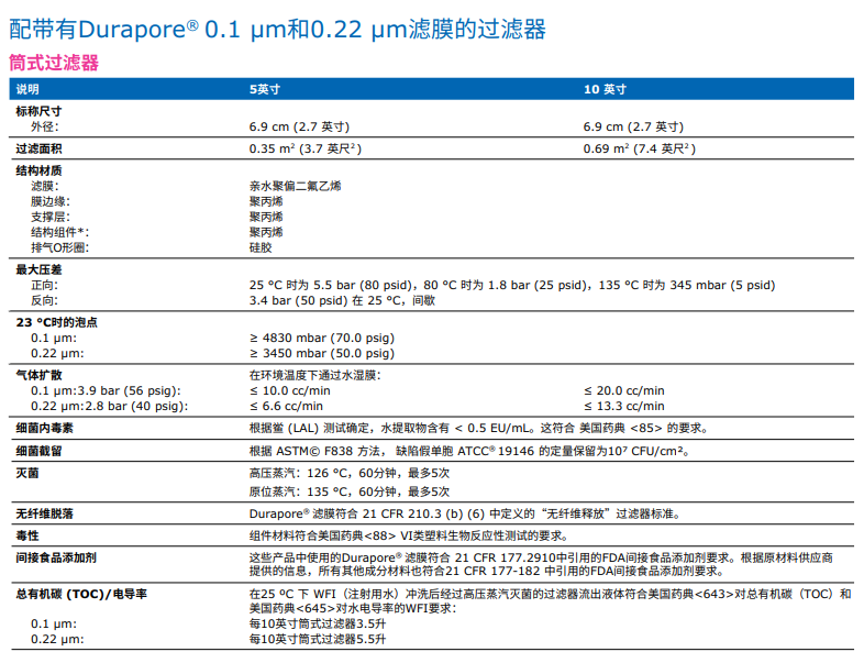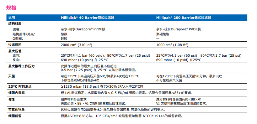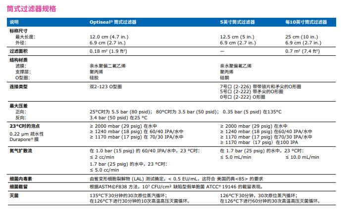 含有疏水性0.22 µm Durapore® 膜的技術(shù)參數(shù):