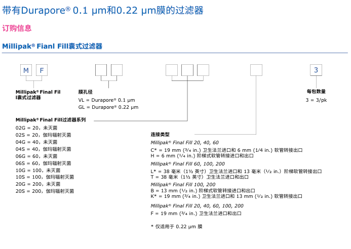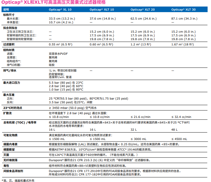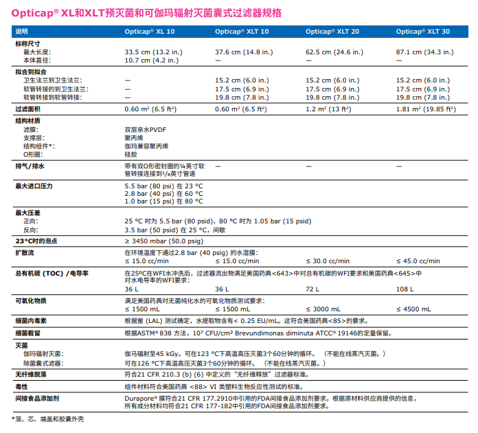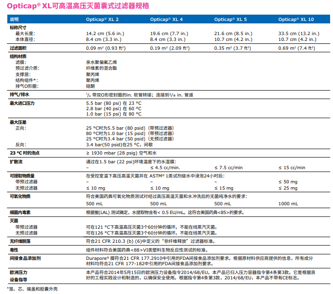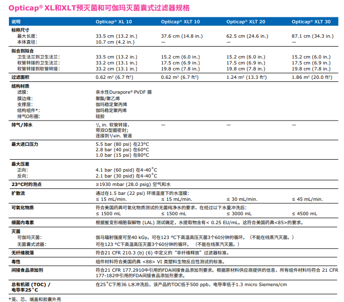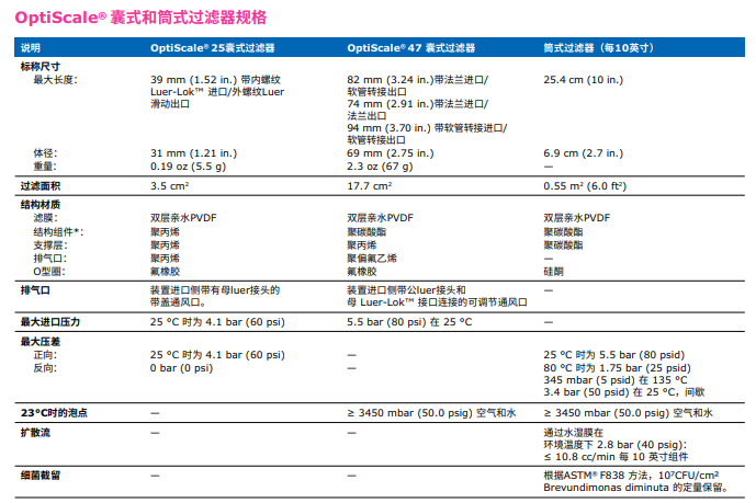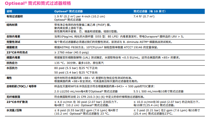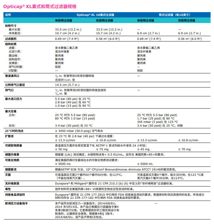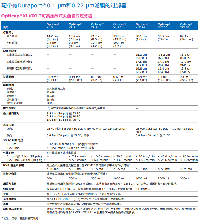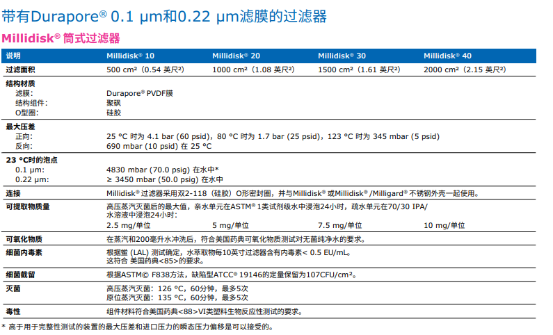 含有疏水性0.22 µm Durapore® 膜的技術(shù)參數(shù):
