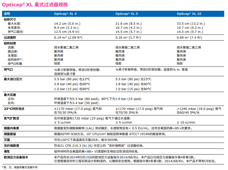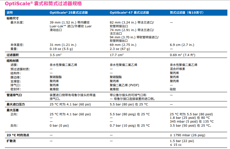 含有Durapore® 0.22 µm親水 -疏水膜的屏障式過濾器的技術(shù)參數(shù):
