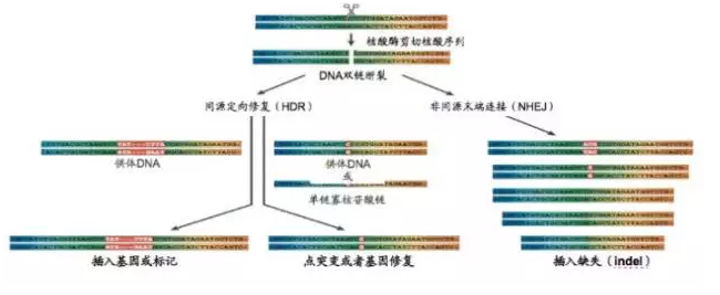 基因編輯技術(shù)指特異性剪切基因組DNA位點(diǎn)的技術(shù)?;蚓庉嬏刂冈诨蚪M上進(jìn)行特定位點(diǎn)的剪切?;蚓庉嬍侵冈诨蚪M上剪切將基因編輯與傳統(tǒng)的暫時(shí)性表達(dá)的質(zhì)粒區(qū)分開(kāi)來(lái),對(duì)特定位點(diǎn)剪切將基因編輯與隨機(jī)整合進(jìn)入基因組的逆轉(zhuǎn)錄病毒區(qū)分開(kāi)來(lái)。下圖2描述了基因編輯的步驟和預(yù)期達(dá)到的效果