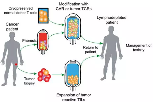 圖4:目前細(xì)胞治療的幾種途徑。通過(guò)修飾,使正常供體細(xì)胞的同種異體排異反應(yīng)失活,同時(shí)使用抗腫瘤的CAR或TCR武裝它;或利用抗腫瘤分子武裝患者自體細(xì)胞。在實(shí)體腫瘤中,活檢標(biāo)本可用來(lái)分離TILs并進(jìn)行擴(kuò)增。大多數(shù)情況下,病人在接受抗腫瘤淋巴細(xì)胞輸注前需要接受必要的預(yù)處理,并須謹(jǐn)慎處置治療引發(fā)的毒性。