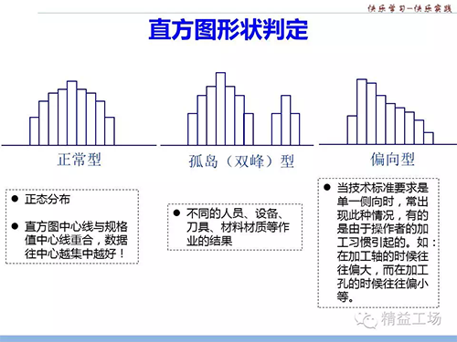 在相同的工藝條件下,加工出來(lái)的產(chǎn)品質(zhì)量會(huì)有一定的波動(dòng)性,這樣可以將抽樣數(shù)據(jù)分成若干組,按其頻度在坐標(biāo)上畫(huà)出一系列的直方形,并將直方形連接起來(lái),用來(lái)觀察圖的形狀,判斷生產(chǎn)過(guò)程質(zhì)量是否穩(wěn)定,了解產(chǎn)品質(zhì)量特性的分布狀況、平均水平以及分散程度,有助于幫助我們判斷制程是否正常。