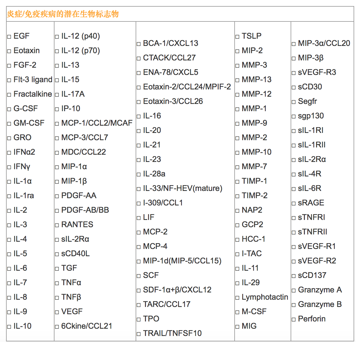 比如文中提到的TNF-α、IL-1、IL-6、IL-12、IFN-α、IFN-γ、MCP-1 和 IL-8細(xì)胞因子,我們僅需一個(gè)試劑盒就能檢測(cè)所有指標(biāo)(貨號(hào)HCYTOMAG-60K-8,Human Cytokine / Chemokine Panel I)。更多的因子可供選擇請(qǐng)看下表。