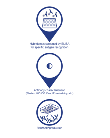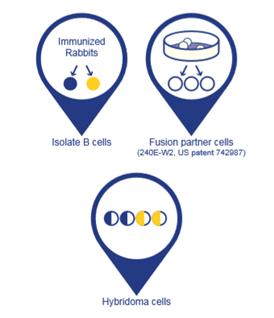 專利的兔融合伴侶細(xì)胞能與兔 B 細(xì)胞融合,形成兔雜交瘤細(xì)胞——真正的兔-兔雜交瘤細(xì)胞 。隨后篩選雜交瘤細(xì)胞以選擇具有特異和敏感的抗原識別能力的克隆體,并采用多種方法鑒定抗體(參見下圖的 RabMAb 生產(chǎn)工藝)。