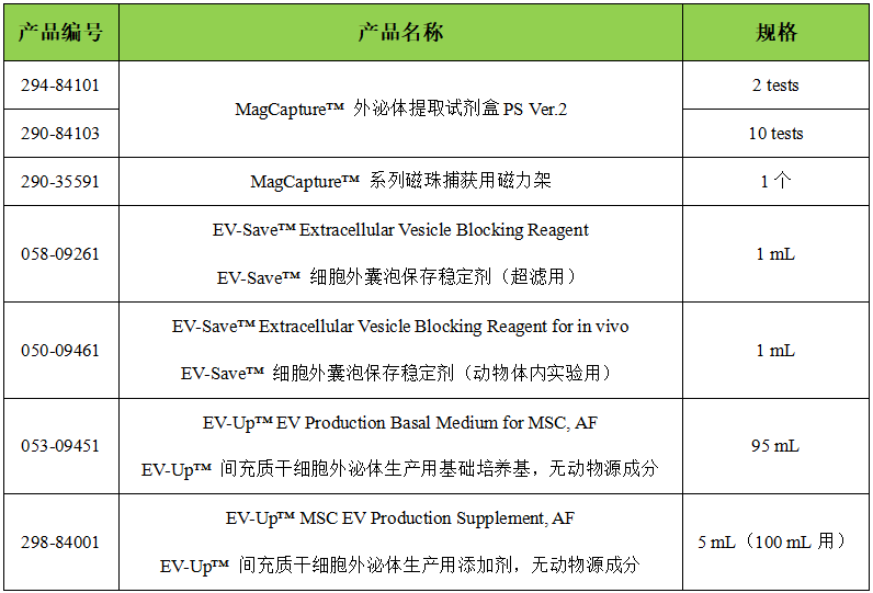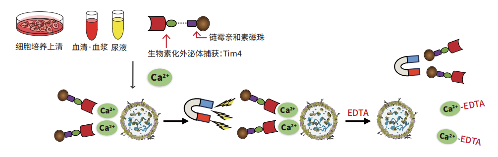 利用這一原理,Wako和金澤大學(xué)醫(yī)學(xué)系免疫學(xué)華山教授共同開發(fā)一款劃時(shí)代的外泌體提取方法,利用Tim4固化磁珠,在鈣離子存在下捕捉培養(yǎng)上清和血清等樣品中的外泌體,再添加螯合劑從而提取外泌體[9]。并且MagCapture™外泌體提取試劑盒PS實(shí)現(xiàn)了比傳統(tǒng)的外泌體純化法更加簡(jiǎn)單地提取高純度完整狀態(tài)的外泌體。