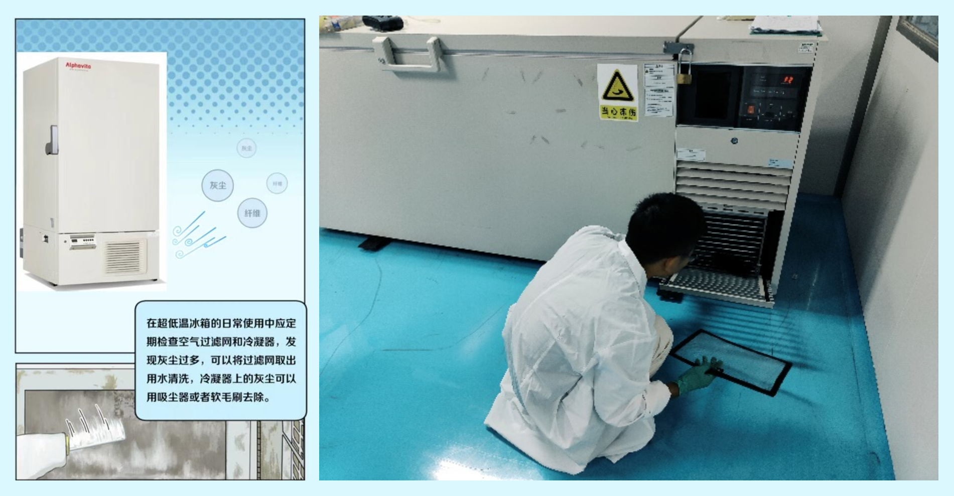 ②超低溫冰箱通過風(fēng)機(jī)帶動(dòng)空氣經(jīng)過冰箱底部的冷凝器將熱量散發(fā)到環(huán)境中;空氣中的灰塵、纖維會(huì)隨氣流進(jìn)入超低溫冰箱底部,附著在過濾網(wǎng)和冷凝器上,過多的附著物會(huì)影響冰箱冷凝器的散熱,從而降低其制冷能力。
