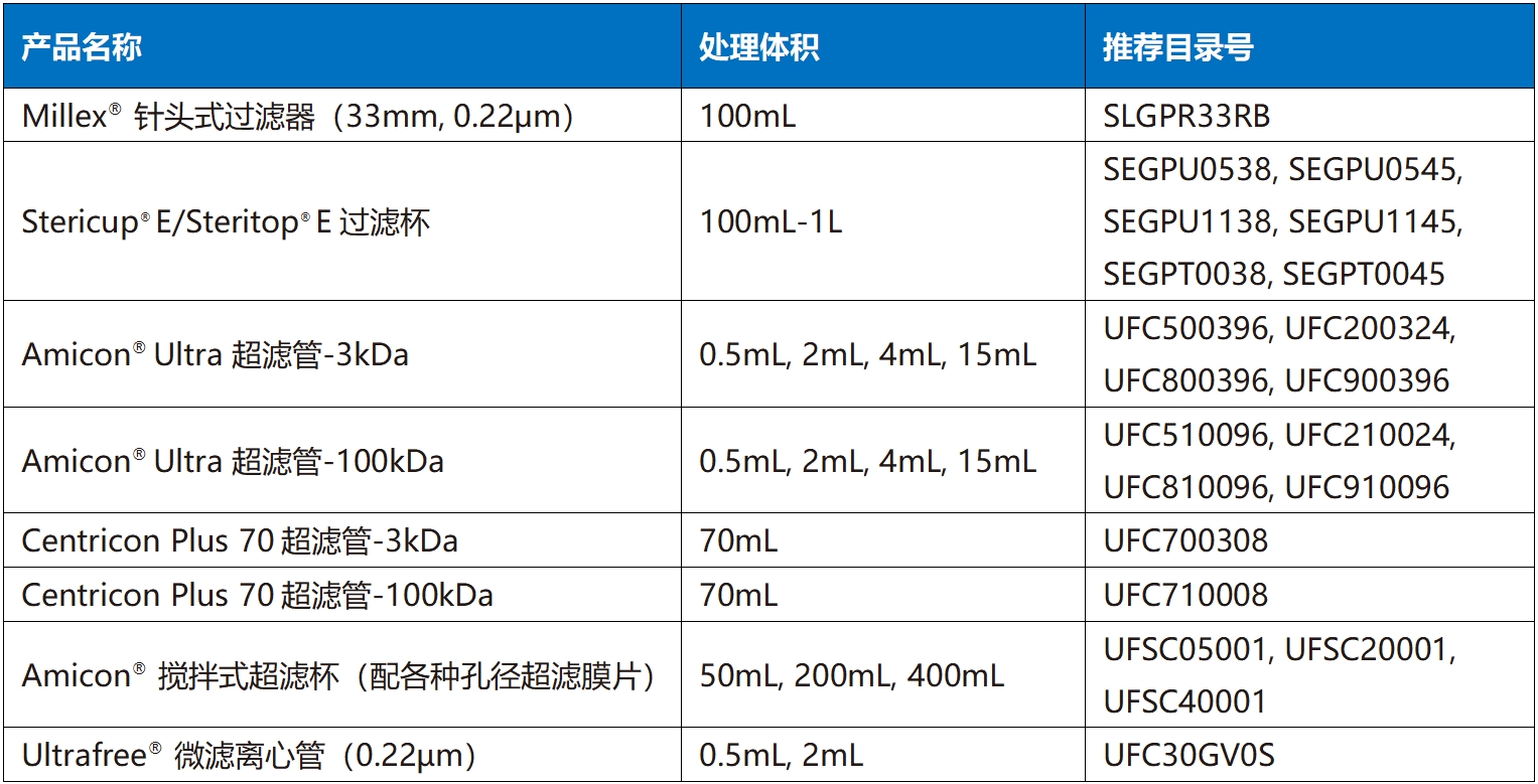 備注:終產(chǎn)品體積通常大約500µL(30倍濃度),但根據(jù)樣品的性質(zhì)、流速和離心時(shí)間可能會(huì)有所不同。有關(guān)樣品體積和終體積的估計(jì),請(qǐng)參閱對(duì)應(yīng)Amicon®Ultra超濾管使用說明書。