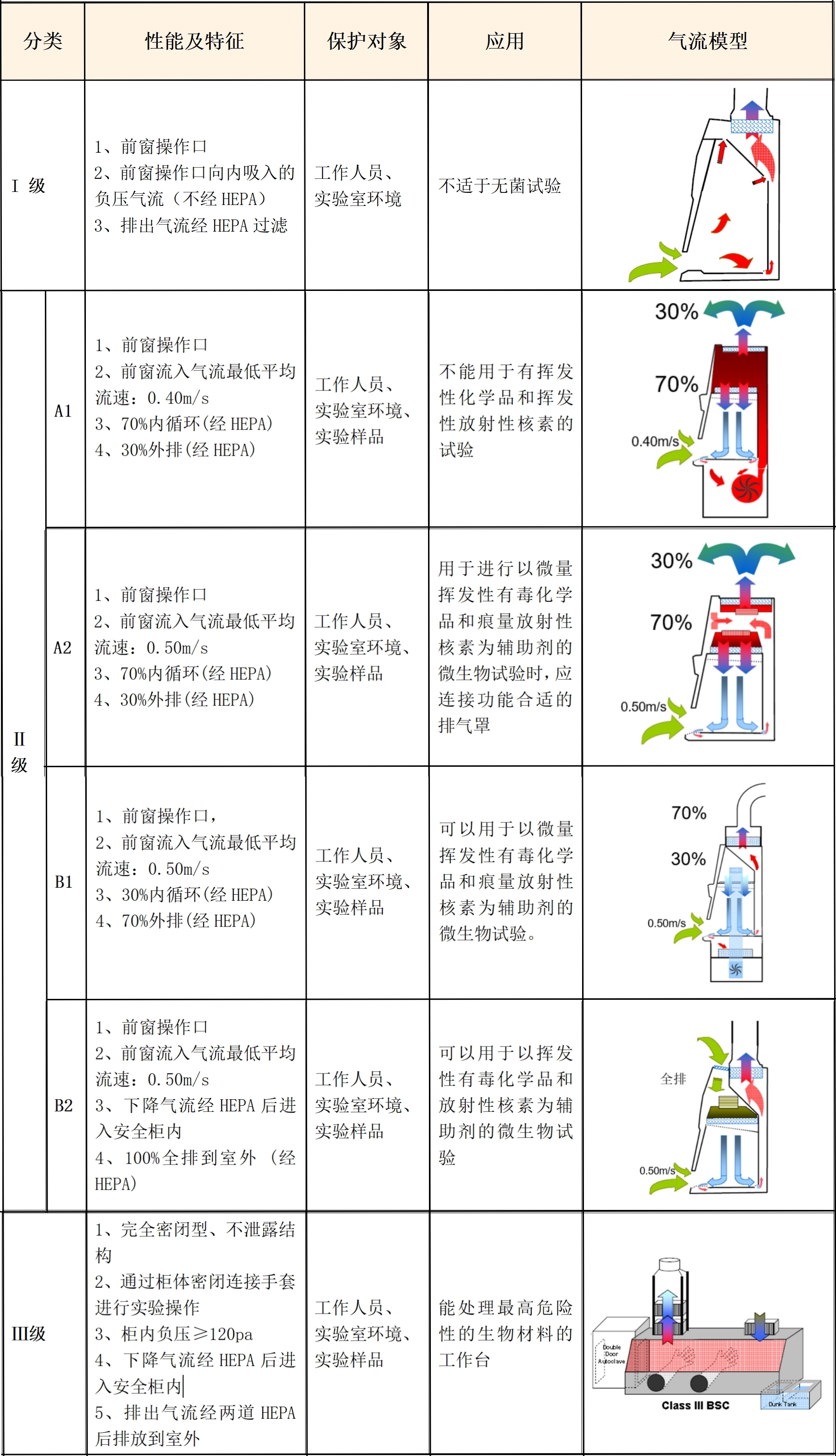 根據(jù)生物安全防護水平和氣流及隔離屏障設計結構差異,生物安全柜可分為Ⅰ級、Ⅱ級、Ⅲ級三個等級,其中二級生物安全柜又分為 A1 型,A2 型,B1 型和 B2 型四個級別。