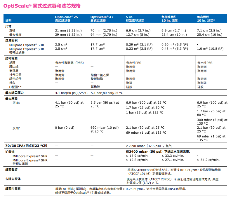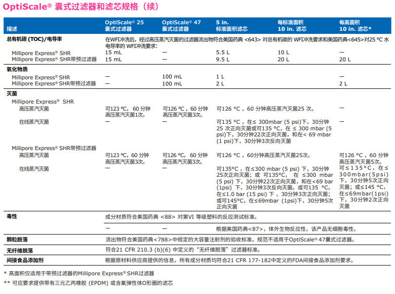 Millipore Express® SHR 過濾器技術(shù)參數(shù):