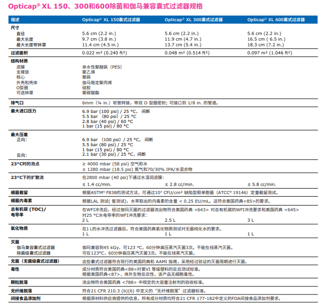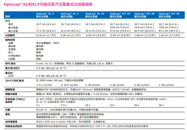 Millipore Express® PHF過濾器的技術(shù)參數(shù):