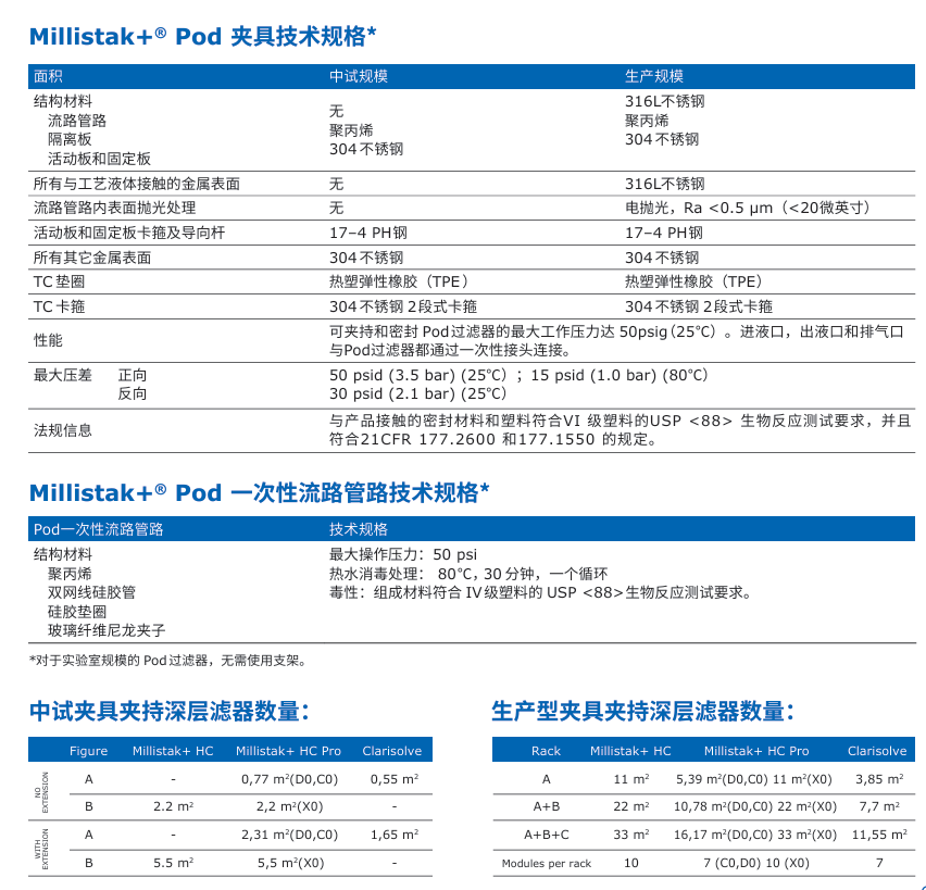 Millistak+® Pod 系統(tǒng)包含:中試型夾具/生產規(guī)模夾具、一次性接頭、一次性隔離板、一次性進液和出液管路。