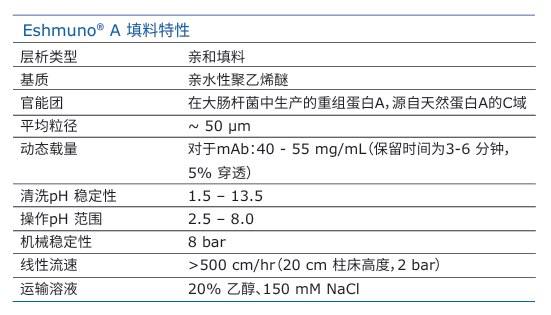 Eshmuno® A 層析填料:剛性、高載量、耐酸 堿的蛋白A親和層析填料,用于含F(xiàn)c 的蛋白質(zhì)的純化。Eshmuno® A 填料可在酸性和/ 或堿性條件下清 洗、消毒,并保持高流速下的高動(dòng)態(tài)載量。此外,它 還提供了從蛋白A柱的洗脫峰的前端和尾端去除 聚集體的有效解決方案。Eshmuno® A填料的這一 性能,減少了含F(xiàn)c蛋白質(zhì)純化工藝中層析之后步驟 的負(fù)擔(dān)。
