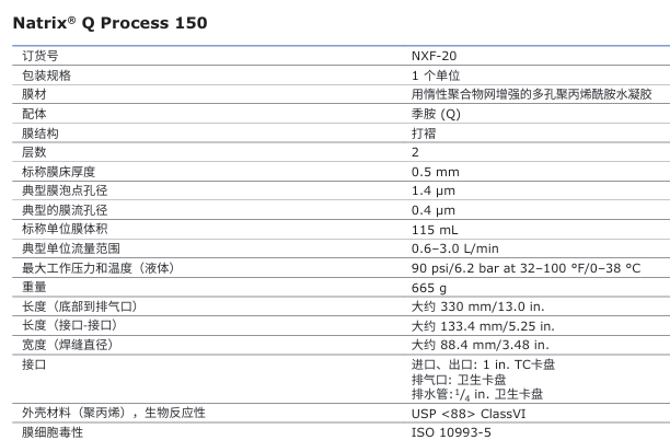 Natrix® Q 陰離子膜是一種多孔聚丙烯酰胺水凝膠,含有高密度的季銨 (Q) 側(cè)鏈結(jié)合基團(tuán),由惰性纖維網(wǎng)物理增強(qiáng)。相互連接的孔結(jié)構(gòu) (標(biāo)稱孔徑,0.4 μm)和高配體密度為蛋白質(zhì)結(jié)合提供了更大的接觸表面 積、高滲透性,并實(shí)現(xiàn)了高通量和高流速下的高載量(某些單抗載量可達(dá)到 10 kg/L),同時(shí)在這些極端操作條件下保持出色的雜質(zhì)清除率。結(jié)合成熟 的 Q 配體技術(shù),這些特性使 Natrix® 膜層析成為商業(yè)規(guī)模層析純化的絕 佳選擇。