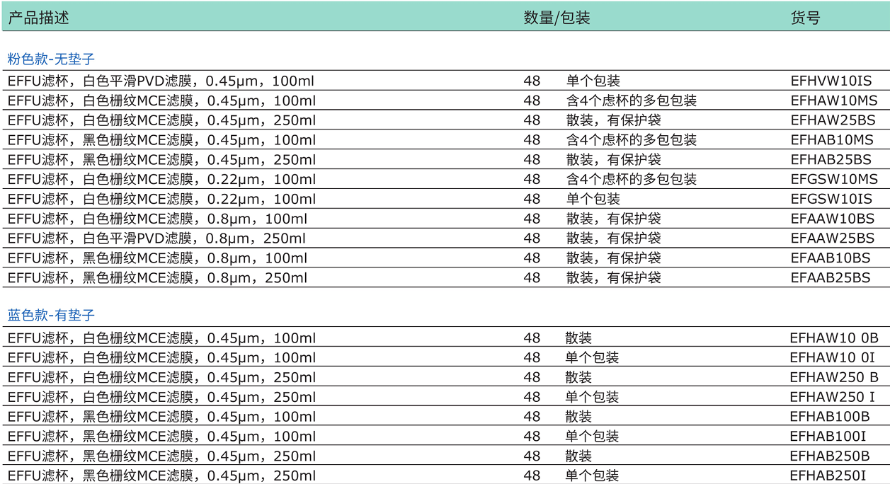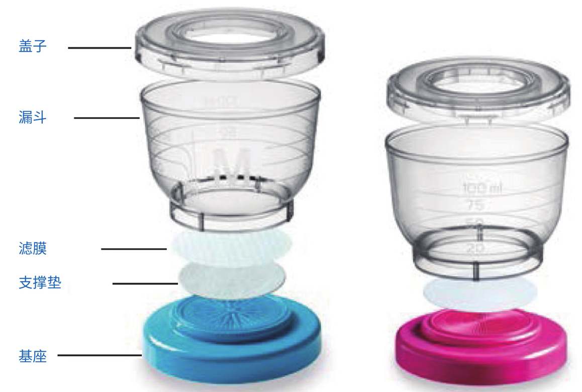 EFFU粉色款配有范圍廣泛的濾膜從0.22到0.8μm最大程度上適合各種應(yīng)用。獲得專利的新型瀝水設(shè) 計(jì)能夠加速處理渾濁難以過濾的基質(zhì)。