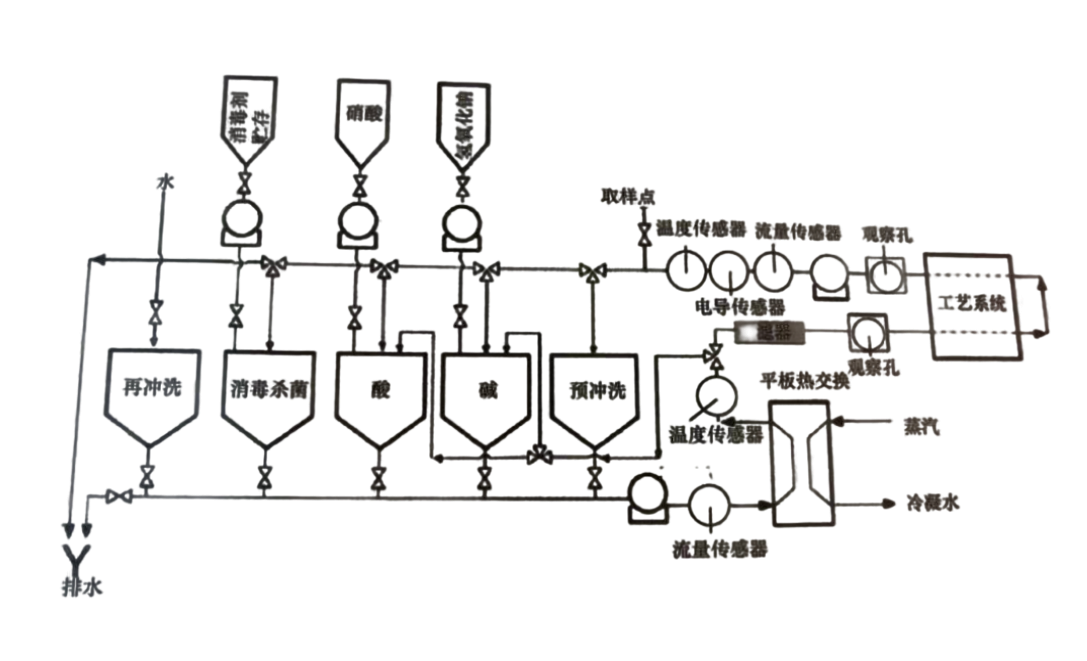 清洗:通常是堿洗或酸洗。這一步的目的是從產(chǎn)品接觸的表面上盡可能去除產(chǎn)品污垢和相關(guān)微生物。由于需要相對長時間的沖洗,為了實現(xiàn)的操作經(jīng)濟(jì)性,需要對清洗溶液進(jìn)行循環(huán)使用。
